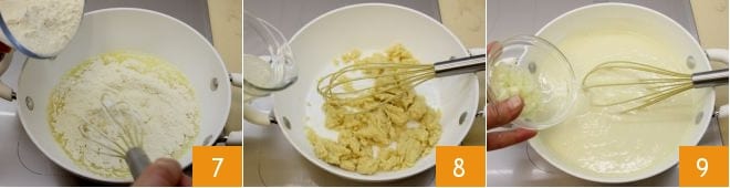 Let it melt over low heat, then slowly add the flour while stirring with a whisk 7. You need to create a roux and give the flour and butter mixture a golden color, being careful not to burn it. Once the roux is ready, pour in the beef broth 8 and continue stirring; season with salt and pepper to taste. Cook over low heat for a few minutes, then add the onion 9.