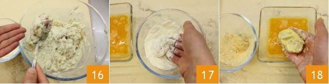 After the necessary time, take the mixture and shape it by taking about a tablespoon at a time 16 to create 30 spherical meatballs. Roll them in flour 17, beaten eggs 18.