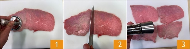 To prepare the Bolognese cutlet, start by taking the slices of meat and pounding them 1. If they are too large, cut them in half for convenience 2. Then season with salt and pepper 3.