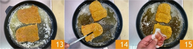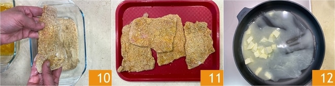 Drain the excess egg well and finally pass them in the breadcrumbs 10. Proceed in this way until they are all breaded 11. At this point, use a pan large enough so as not to overlap the slices, otherwise you will have to cook them in more batches. Put the butter in the pan and let it melt over medium heat 12.