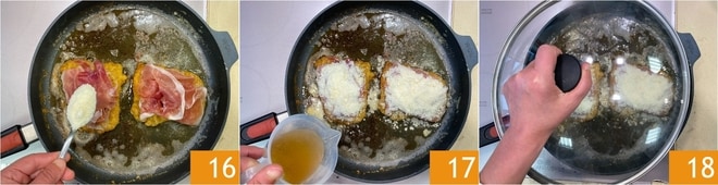 Place the cutlets inside and let them brown for about 3 minutes per side 13, then turn them over 14. Place the prosciutto on top 15.