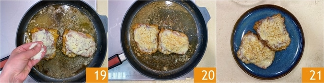 Then add more grated Parmesan 19 and cover again. Cook for another 2 minutes with the lid on until the cheese is melted 20. Then serve the cutlets adding some cooking juices on top 21.