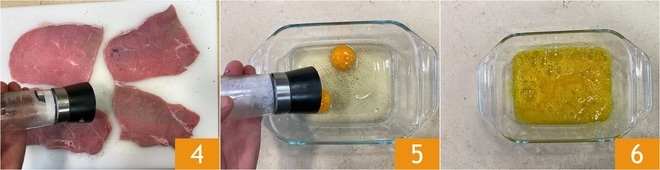 Turn them over and season the other side in the same way 4. For the breading: break the eggs into a bowl and add salt and pepper 5, beat well 6.