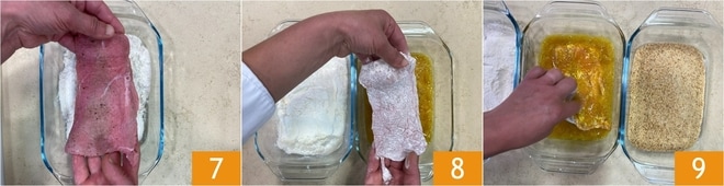 Now coat the meat slices first in the flour 7, then in the egg 8 9.