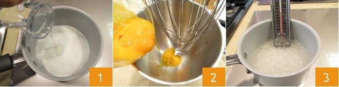 In the meantime, prepare the Buttercream. Pour the sugar and water into a thick-bottomed saucepan 1, then heat it over low heat, stirring occasionally with a steel spoon. Meanwhile, separate the eggs and pour the yolks into the bowl of a stand mixer 2. (Once you've set aside the 30 grams of egg whites needed for the royal icing, with the leftover egg whites from both the pastry cream and this buttercream, try making crispy French meringue (basic dough) or some tasty Lingue di gatto (flat cookies)). When the sugar has melted, stop stirring and bring the syrup to 250°F 3, using a kitchen thermometer to measure the correct temperature. Only when the syrup is almost at the indicated temperature, start the stand mixer and begin to beat the yolks.