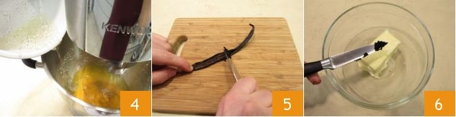 Add the syrup in a thin stream 4 to the bowl of the stand mixer, which by then will have reached the right temperature, and continue to whip until completely cooled. Meanwhile, cut open the vanilla bean and, using a knife, scrape out the seeds 5. At this point, place the room-temperature butter in a bowl, and add the vanilla bean seeds 6.