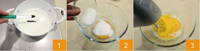 While the cake is baking, make the Pastry cream. Combine the milk and cream in a large saucepan and place it over the heat. Cut the vanilla bean with a knife, extract the seeds, and add them along with the bean to the pan with milk and cream 1. Bring almost to a boil, then turn off the heat and let it infuse for 5 minutes. Meanwhile, separate the egg whites from the yolks and gather the yolks in a large bowl. Pour the sugar 2 into the bowl with the yolks and beat with an electric mixer 3 or by hand until you have a fluffy and foamy cream.