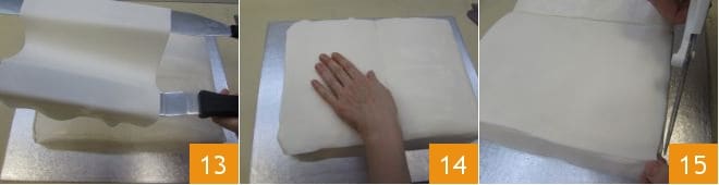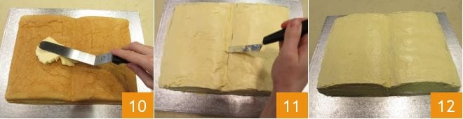 With the help of two spatulas 13, gently position it on one half of the cake to create the sheets of your book where you will write. Repeat the operation for the second half and smooth it out again 14. Trim any excess with scissors 15 and knead it again.