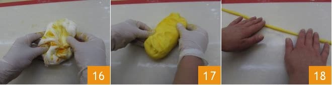 Add a little more fondant to the scraps and work it by adding a few drops of yellow food coloring 16 until you achieve a bright color 17. Take a portion and work it with your hands on a silicone mat to create a log about 1/2 inch thick 18, and set it aside.