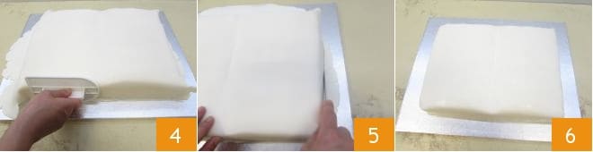 Using a smoother spatula, smooth the surface and sides 5, then trim off the excess fondant 6 to completely reveal the cake board 7.
