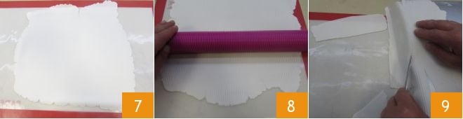 Roll out another portion of white fondant to create a thick rectangle 7 and, using a special rolling pin, imprint parallel lines on it 8, then use the cake pan as a template to position the fondant layer on its sides and trim what will become the pages of your book 9. Continue this way to create both the side and front pages; you can use a string to get the right dimensions. Re-knead the fondant scraps and set them aside, always wrapped in plastic wrap to prevent them from drying out.