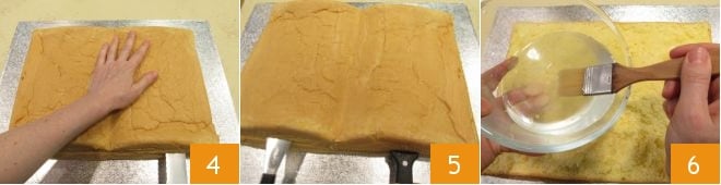 With the help of a knife with a long blade, cut the cake by passing the knife inside the incision and making a parallel motion to the cake 4. Lift the first layer of the sponge cake, inserting 2 sufficiently long spatulas inside, and lifting them gently 5. Using a brush, soak the bottom layer of the cake with the now-cold syrup 6.