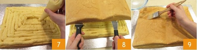 Place the pastry cream in a pastry bag and, applying pressure with your right hand, cover the entire surface of the cake 7. Position the top layer of the sponge cake 8, apply slight pressure with your hands to make it adhere well, then soak the surface with the remaining syrup 9.