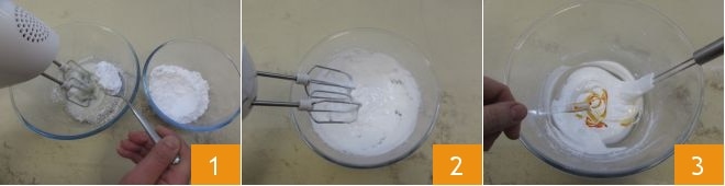 Meanwhile, prepare the Royal icing Place the egg whites in a bowl, along with a few drops of lemon juice, which will make the mixture shinier. While mixing with a mixer, add the powdered sugar, one tablespoon at a time 1. Once all the sugar is added, you will have a smooth and thick mixture 2, then add a few drops of yellow food coloring and mix with a spatula.