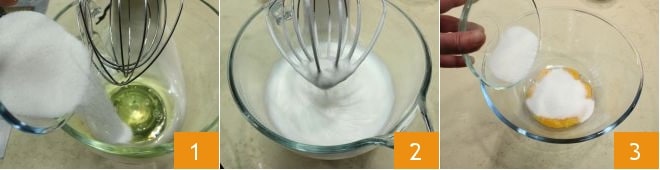 To prepare the book cake, start by making the Sponge cake using the cold separation method. Take the eggs, which should be at room temperature, and carefully separate the yolks from the whites. Place the egg whites in the bowl of a stand mixer and add about 1/3 of the sugar 1 and begin to beat them at medium speed until they are glossy 2, but not stiff. You will obtain a foamy mixture, not clumpy; set it aside and in the meantime, add the remaining sugar to the yolks 3.
