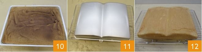 Bake in a preheated static oven at 356°F for 60-70 minutes (320°F for about 50-60 minutes if using a fan oven). Once baked 10, let it cool in the pan, then flip it 11, remove it from the pan, and let it cool completely on a wire rack 12.