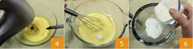 Begin to beat these as well, using a mixer, and once you have obtained a foamy mixture with good aeration and a light yellow color, add the seeds from the vanilla bean 4 (to extract them, you will need to cut and scrape the bean with a knife) and stop the machine. Gently fold the beaten yolks into the egg whites and mix with a whisk 5 (or a spatula) from bottom to top to avoid deflating the mixture. At this point, sift the flour and cornstarch 6 directly onto the mixture,