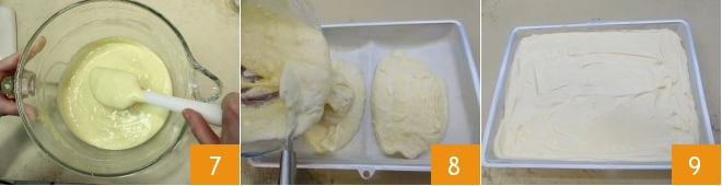 and using a spatula, gently combine all the ingredients 7. Butter and flour the appropriate baking pan, with dimensions of 14x11 inches, pour in the mixture 8, and level the surface with a spatula 9.