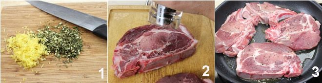 To prepare pork chops with beer and aromatic herbs, start by cleaning and chopping the garlic, aromatic herbs, and lemon peel 1. Place the 4 chops on a cutting board and season them with salt and pepper 2 on each side. Heat the oil in a pan and cook the meat for 5-6 minutes on each side 3.
