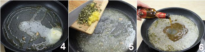 Set the chops aside, and in the same pan add the butter 4, the mixture of aromatic herbs 5, and the beer 6. Let it thicken for a minute, stirring well, then turn off the heat. Place the chops on plates and drizzle each with the beer sauce. Serve them while still steaming.