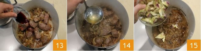 When the onions are softened, return the meat to the pot, increase the heat, and deglaze with room temperature red wine, allowing it to evaporate 13. Adjust the salt, then pour the hot broth you have prepared 14 until it covers all the meat, then close with a lid and let it cook on very low heat for about 3 hours. After this time, drain the artichokes from the acidulated water and add them to the braised beef, letting cook for another 40 minutes 15,