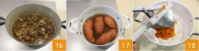 then, when ready, turn off the heat 16. Meanwhile, you can prepare the sweet potato purée: boil the potatoes in abundant water 17 (depending on the size, it will take 40 to 90 minutes; you can check the cooking with a skewer); drain them, then peel and mash them directly in the pan with a potato masher 18 or a food mill.