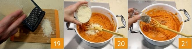Grate the cheese 19, turn on the heat, and add it to the purée 20, adjusting salt and pepper 21.