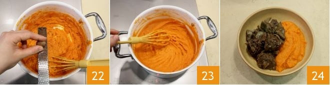 Flavor with grated nutmeg 22 and mix with a whisk until you obtain a thick and homogeneous purée 23; finally, you can plate and serve your braised beef with artichokes and sweet potato purée 24.