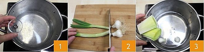 To prepare steamed sea bass with vegetables, first take care of the water for your steamer. Take a pot, pour in the water, and flavor it with wine and peppercorns 1; clean the spring onions and remove the stems without discarding them 2; also clean the leek, removing the greener part and peeling the outer leaves, cut it in half and add one part to the water along with the spring onions 3. Bring everything to a boil.