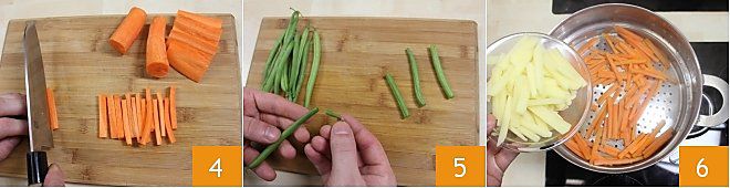 In the meantime, prepare the vegetables that will accompany the sea bass: clean 2 carrots, the zucchini, and the potatoes and cut everything into sticks 4, for more details on cutting vegetables click here (How to cut vegetables). Remove the ends of the green beans 5 and place the vegetables in the steamer: first the carrots and potatoes 6, cook for a couple of minutes and