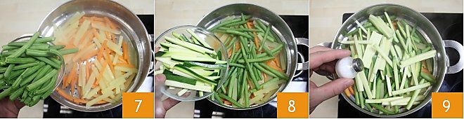 also add the green beans 7 and lastly the zucchini 8, then salt and pepper 9.