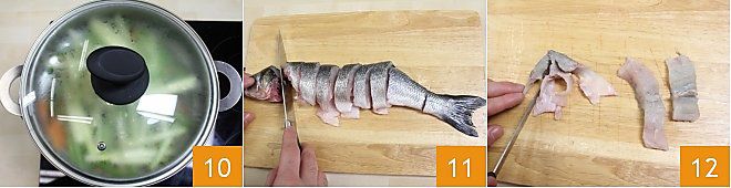 Cover with a lid and let cook 10 until the vegetables are soft: it will take about 10 minutes. In the meantime, take care of the fish, take the sea bass already gutted and scaled; if you have an uncleaned sea bass, see the Cooking School card How to clean the sea bream (How to clean sea bream), you should get about 28 oz of cleaned sea bass. Rinse it under running water, then place it on a cutting board, remove the fins, and cut into round sections 11. Remove the central bone from each section, not the skin, and open them well, being careful not to break them 12.