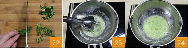 Once ready, drain and chop them together with the basil 22 and add them to the butter, which you have softened in a double boiler, then with an immersion blender, blend everything until you get a homogeneous sauce (23-24), adjust the salt and remove from the double boiler.