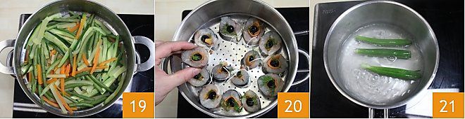 When the vegetables are cooked 19, remove them from the steamer and place the sea bass medallions in their place 20, pepper, and cook for 10 minutes, covering with a lid. In a small saucepan, pour a bit of water, bring to a boil, and blanch the spring onion stems you set aside for a couple of minutes 21.