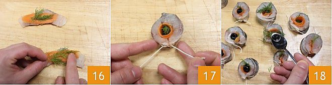on top of the carrot, place a sprig of dill or chopped parsley 16, fold the ends of the sections towards the center, close the small medallion obtained with a piece of kitchen twine 17 and secure the twine with a double knot. Once all the medallions are obtained, place a pitted black olive in the center of each one 18.