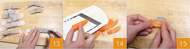 With a special tweezer, remove all the bones present in the flesh, run your fingertip over the fish surface to find them more easily 13. Then take the remaining carrot and with the help of a mandoline, slice it into "ribbons," that is, very thin slices lengthwise 14. Place the slices obtained on each piece of fish 15 that you have previously salted on the surface,