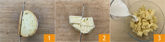 To make the bread meatballs, first remove the crust from the stale bread 1, then cut the crumb into cubes 2. Transfer the bread to a bowl and pour the milk over it 3.