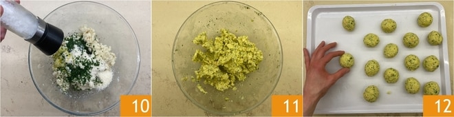 Salt 10, pepper, and mix the mixture with your hands or a spoon 11. At this point, form balls weighing about 1.2 oz each and place them on a tray 12; with these amounts, you should get about 15.