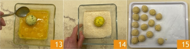 Proceed to breading: dip each meatball in the egg, which you have previously beaten with a pinch of salt 13, then coat it with breadcrumbs 14. Continue this way to bread all the meatballs 15.