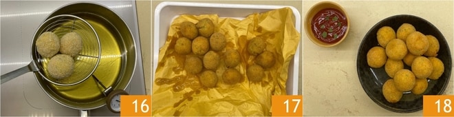 Heat the seed oil to a temperature of 340°F, then fry a few meatballs at a time for 2-3 minutes. When they are evenly golden, drain and transfer to paper towels 17. Your bread meatballs are ready to be served hot and crispy, accompanied by a sauce of your choice 18!