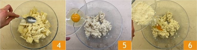 Press with your hands or a spoon to ensure all the cubes are soaked in milk 4, then let them rest for 5 minutes. After this time, add an egg 5 and the grated Parmigiano Reggiano DOP 6.