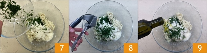 Also add the chopped parsley 7 and the crushed garlic clove 8, then drizzle a little olive oil 9.