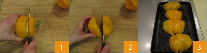 To prepare the bread rolls with vegetables and goat cheese, first take care of the yellow peppers. Remove the part with the stalk 1 and cut them in half 2. Cook them briefly on a hot grill 3,