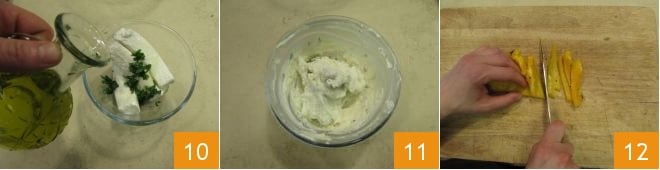 Create the goat cheese cream by adding chopped basil, a drizzle of oil 10, salt, and pepper to the cheese. Mix everything with a spatula until you get a homogeneous cream 11. Take the peppers and cut them into strips 12,