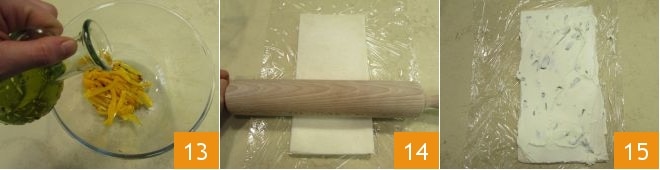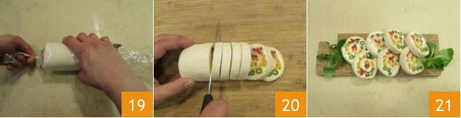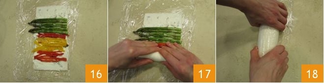 and place the vegetables, leaving the end part free 16. Roll up the filled bread tightly 17, then wrap it in plastic wrap 18
