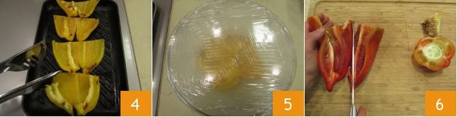 turning them halfway through cooking 4, about 5 minutes will suffice. Once they are roasted but still crunchy, transfer them to a bowl and cover with plastic wrap 5. Repeat the same operation for the red peppers, cutting them in half 6