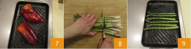 and cooking them as before 7. Then place them in another small bowl and cover with plastic wrap. Move on to the asparagus, wash them and remove the bottom part of the stem 8. Grill these for about 5 minutes as well 9 and set them aside.