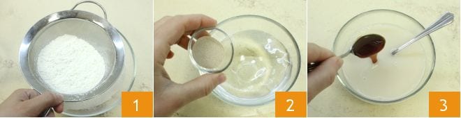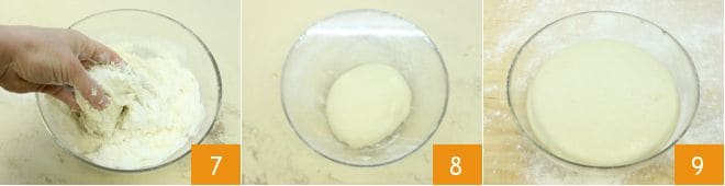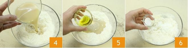 Pour the mixture into the bowl with the flour 4, add the olive oil 5 and salt 6.
