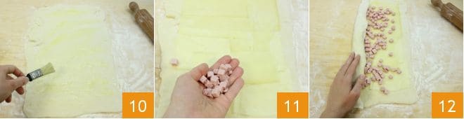Transfer it to the countertop and roll out a sheet of 10x14 inches, brush the surface with a mixture of beaten egg and a tablespoon of milk 10. Now move on to the filling: place the fontina slices on the surface of the bread sheet, leaving a 3/4 inch edge to facilitate rolling. Distribute the diced ham 11. Now roll the dough from the long side 12.