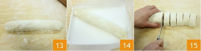 Once rolled 13, transfer it to a tray covered with parchment paper 14 and let it rest in the refrigerator for at least half an hour. After this time, cut the roll into slices 1 inch thick 15, you will get about 12 snails. Transfer them to a baking sheet lined with parchment paper, and let the snails rise for at least 1 hour in an oven with the light on.